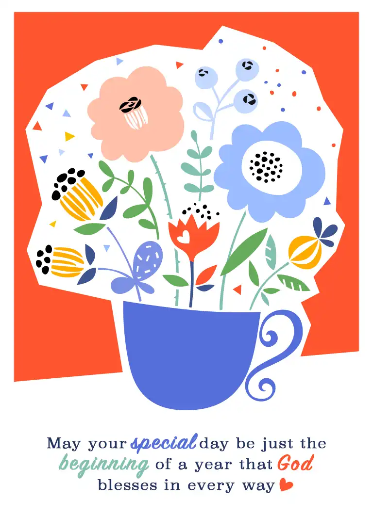 Send wishes for a day filled with peace and simple joys using this Christian card. The tea cup design invokes a sense of slowing down to enjoy God’s blessings, making it a thoughtful birthday greeting for a dear friend.